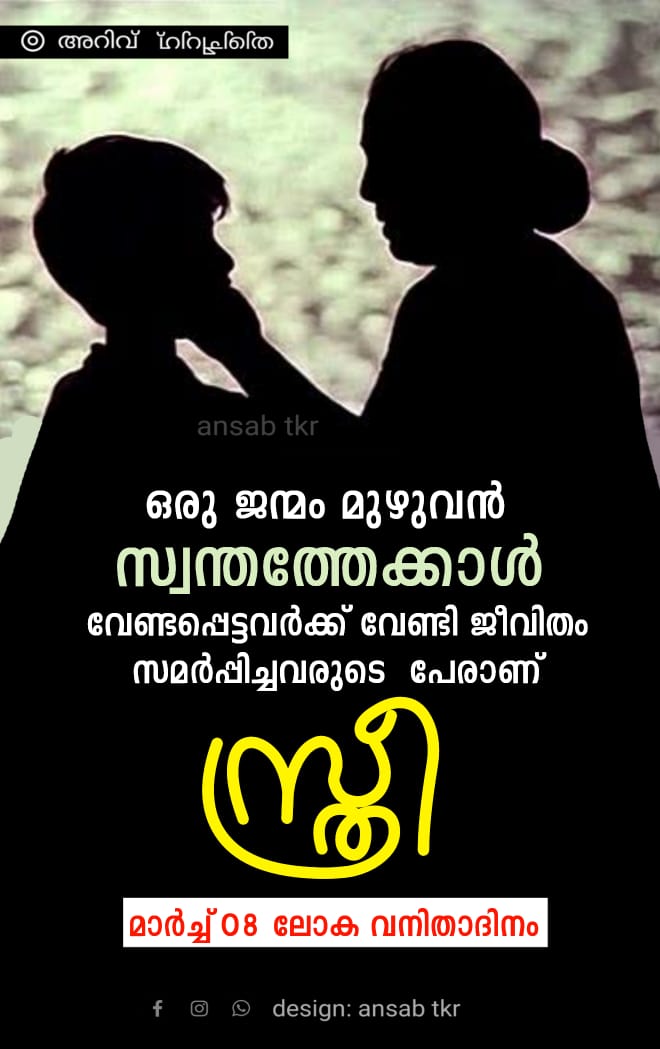ഇന്നലെ ലോക വനിതാ ദിനമായിരുന്നു. ഏതെങ്കിലും ഒരു ദിവസം മാത്രം ആഘോഷിക്കപ്പെടേണ്ടതല്ല സ്ത്രീയുടെ ജീവിതവും അവളുടെ മഹത്വവും. സർവംസഹയാണ് സ്ത്രീ. അവനവന് വേണ്ടി എന്നതിനേക്കാൾ അപരർക്ക് വേണ്ടി ജീവിക്കുന്ന സമർപ്പണ സന്നദ്ധതയുടെ മറുനാമമാണ് സ്ത്രീ. അവൾ അമ്മയായും ഭാര്യയായും സഹോദരിയായും ജീവിതത്തിൽ തണലും വെളിച്ചവുമാകുന്നു. പരിശുദ്ധ ഇസ്ലാം സ്ത്രീയെ ഉന്നതമായ വിതാനത്തിൽ പ്രതിഷ്ഠിച്ചു. സ്ത്രീ മനുഷ്യനാണോ? മനുഷ്യനാണെങ്കിൽ തന്നെ ആത്മാവുണ്ടോ, ഇല്ലേ തുടങ്ങിയ ചർച്ചകൾ നടന്നിരുന്ന കാലത്താണ്, പെൺകുഞ്ഞ് ജീവനോടെ കുഴിച്ച് മൂടപ്പെട്ടിരുന്ന കാലത്താണ് സ്ത്രീത്വത്തിൻ്റെ മഹത്വം ഇസ്ലാം പ്രഖ്യാപിച്ചത്. മാതാവിൻ്റെ കാൽക്കീഴിലാണ് സ്വർഗമെന്ന് ഇസ്ലാം പറഞ്ഞ് വെച്ചു. സച്ചരിതയായ ഭാര്യയാണ് ഏറ്റവും വലിയ സമ്പത്തെന്ന് ഓർമപ്പെടുത്തി. പെണ്ണിനെ പോറ്റുന്നത് സ്വർഗ ലബ്ധിക്ക് കാരണമാണെന്ന് പ്രോൽസാഹിപ്പിച്ചു. ഭർത്താവിൻ്റെ വീട്ടിലെ റാണിയായി അവളെ വാഴിച്ചു. പുരുഷൻ ഭരിക്കുന്നവ ( ഭർത്താവ്) നും സ്ത്രീ ഭരിക്കപ്പെടേണ്ടവ ( ഭാര്യ) ളും എന്നല്ല ഇസ്ലാം പറഞ്ഞത്, മറിച്ച് സ്ത്രീയും പുരുഷനും ഇണ തുണകളാണെന്നാണ്.(സൗജ്). സ്ത്രീ-പുരുഷ സമത്വം ഉട്ടോപ്യയാണ്. വാദിക്കുന്നവർക്ക് തന്നെ നടപ്പിലാക്കാൻ കഴിഞ്ഞിട്ടില്ല. കഴിയുകയുമില്ല. ആൺ പെണ്ണിനെപ്പോലെയല്ല, പെണ്ണ് ആണിനെപ്പോലെയുമല്ല. സ്ത്രീക്ക് വേണ്ടത് സമത്വമല്ല. അമിത സ്വാതന്ത്ര്യവുമല്ല. സുരക്ഷിതത്വമാണ്. അത് പ്രദാനം ചെയ്യുന്ന ദർശനമാണ് ഇസ്ലാമിൻ്റേത്. ജീവിതത്തിലെ നല്ല പാതിയാണ് പെണ്ണ്. കുടുംബത്തിലെ വിളക്കാണ് പെണ്ണ്. പെണ്ണിനോട് നന്നായി പെരുമാറുന്നവരാണ് നിങ്ങളിൽ നല്ലവരെന്ന്, അടിച്ചമർത്തപ്പെട്ട സ്ത്രീത്വത്തിൻ്റെ സമുദ്ധാരകനായ മുഹമ്മദ് മുസ്ഥഫാ (സ്വ).