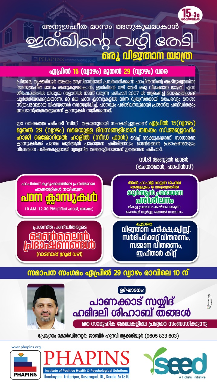 ഫാപിൻസിൻ്റെ ആഭിമുഖ്യത്തിൽ 'അനുഗ്രഹീത മാസം അനുകൂലമാകാൻ, ഇത്ഖിൻ്റെ വഴി തേടി ഒരു വിജ്ഞാന യാത്ര' ഇന്ന് ആരംഭിക്കുകയാണ്.ഇ.അ. കഴിഞ്ഞ ഒന്നരപ്പതിറ്റാണ്ടായി, വിശുദ്ധ റമളാനിൽ ഈ വിജ്ഞാന യാത്ര അഭംഗുരം തുടരുന്നു. കോവിഡ് പ്രതിസന്ധി മൂർത്തീമദ്ഭാവം പ്രാപിച്ച കഴിഞ്ഞ വർഷവും ഓൺലൈനായിട്ടാണെങ്കിലും പൂർവോപരി ആവേശത്തോടെ പരിപാടി നടന്നു. കോവിഡ് പ്രതിസന്ധി നിലനിൽക്കുന്ന സാഹചര്യത്തിൽ ഇത്തവണ ഓൺലൈനായും ഓഫ് ലൈനായും ക്ലാസുകൾ നടക്കും. 'സീഡ്' തങ്കയം എന്ന സംഘടനയുമായി സഹകരിച്ചാണ് ഇത്തവണ പരിപാടി നടക്കുന്നത്. റമളാനിൽ വ്യാപകമായി മത പഠന ക്ലാസുകൾ നടക്കാറുണ്ട്. അവയിൽ നിന്നൊക്കെ വ്യത്യസ്തമായി കൂടുതൽ ഫലപ്രദമായ രീതിയും ശൈലിയുമാണ് 'ഇത്ഖിൻ്റെ വഴി തേടി'യിൽ സ്വീകരിക്കുന്നത്. വിഷയ വൈവിധ്യമാണ് ഈ പരിപാടിയുടെ പ്രത്യേകതകളിലൊന്ന്. മതപരമായ വിഷയങ്ങളോടൊപ്പം ആരോഗ്യപരവും മന:ശാസ്ത്രപരവുമായ വിഷയങ്ങൾ കൂടി ചർച്ച ചെയ്യപ്പെടുന്നു. ഫാപിൻസ് കുടുംബാംഗങ്ങൾ തന്നെയായ പ്രഗൽഭരായ ഫാക്കൽറ്റികൾ - അവരിൽ മത പണ്ഡിതരുണ്ട്, ഡോക്ടർമാരുണ്ട്, മന:ശാസ്ത്രജ്ഞരുണ്ട്, ലേഡീസ് കൗൺസിലർമാരും ട്രൈയിനർമാരുമുണ്ട് - ക്ലാസുകൾ നയിക്കുന്നു. ക്ലാസുകൾ കേട്ട് പോകുക മാത്രം ചെയ്യുന്നതിന് പകരം പഠനത്തോടൊപ്പം പരിശീലനവുമുണ്ട്. വ്യത്യസ്തമായ ടാസ്കുകളുണ്ട്. ക്ലാസുകളെ ആസ്പദിച്ച് വിജ്ഞാന പരീക്ഷയും സമ്മാനങ്ങളുമുണ്ട്. ഇത്തവണ ഖുർആൻ പാരായണ പരിശീലനവും കൂടിയുണ്ട്. പാരായണ നിയമങ്ങൾ പാലിച്ച്, ആസ്വദിച്ച് ഓതുമ്പോൾ, അതൊരു അനുഭവം തന്നെയാണ്. ഒരു ഹാഫിളിൻ്റെ നേതൃത്വത്തിലാണ് ഇത് നടക്കുക. മികച്ച പ്രകടനം കാഴ്ച വെക്കുന്ന ഒരാൾക്ക് ഗോൾഡ് മെഡൽ സമ്മാനവുമുണ്ട്. നേരിട്ട് ക്ലാസിൽ പങ്കെടുക്കാൻ കഴിയാത്തവർക്ക് ഓൺലൈൻ ക്ലാസുകൾ നൽകുന്നു. എല്ലാ ദിവസവും ഓൺലൈൻ ലൈവ് ക്വിസും വിജയികൾക്ക് ആകർഷകമായ സമ്മാനങ്ങളുമുണ്ട്. കഴിഞ്ഞ 15 വർഷങ്ങളിലായി നിരവധി സഹോദരിമാരും കുടുംബിനികളും ഈ വിജ്ഞാന യാത്രയുടെ ഭാഗമാവുന്നു. ഇതിൻ്റെ സദ്ഫലങ്ങളും മാറ്റങ്ങളും ജീവിതത്തിൽ അനുഭവവേദ്യമാണെന്ന് അവർ സാക്ഷ്യപ്പെടുത്തുന്നു. ഏത് പ്രതിസന്ധികൾക്കിടയിലും ഈ നൻമ മുടങ്ങരുതെന്നാണ് ഉൽക്കടമായ ആഗ്രഹം. അല്ലാഹുവിങ്കലുള്ള സ്വീകാര്യതയും പ്രധാനമാണ്. കഅബയുടെ പുനർനിർമാണം കഴിഞ്ഞപ്പോൾ പോലും ഇബ്രാഹിം നബിയും ഇസ്മാഈൽ നബിയും തേടിയത് അല്ലാഹുവിങ്കലുള്ള സ്വീകാര്യതയാണ്. അല്ലാഹുവേ, ഞങ്ങളേയും ഞങ്ങളുടെ കർമങ്ങളേയും സ്വീകരിക്കേണമേ!