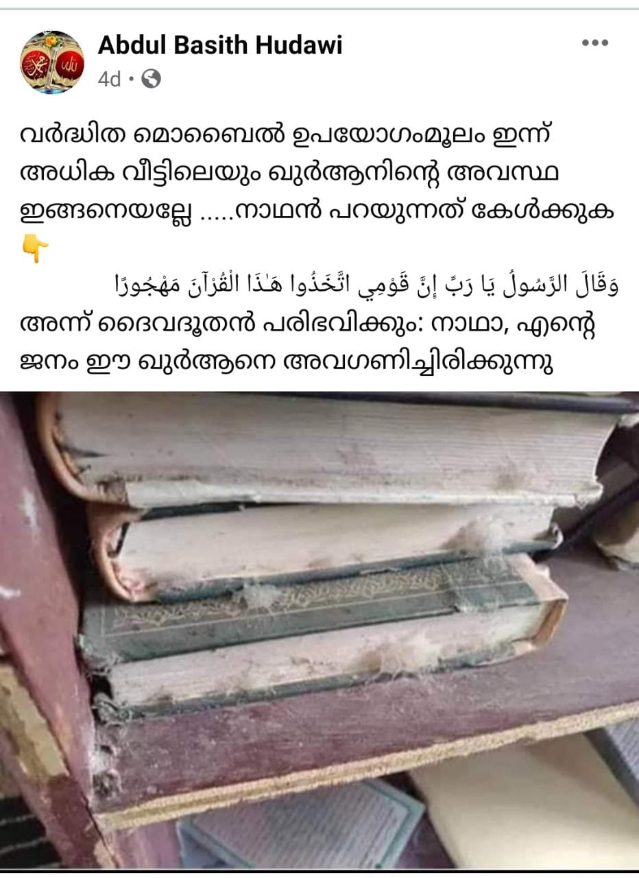 തളങ്കര മാലിക് ദീനാർ അക്കാദമിയിലെ അധ്യാപകനും എൻ്റെ മകൻ്റെ ഉസ്താദുമായ അബ്ദുൽ ബാസിത്ത് ഹുദവിയുടെ ഒരു ഫൈസ് ബുക്ക് പോസ്റ്റ് കണ്ടു. ചിന്തനീയമായ ഒരു വിഷയമായത് കൊണ്ട് ഈ പംക്തിയിൽ പങ്ക് വെക്കുന്നു. വിശുദ്ധ ഖുർആൻ കേവലം പാരായണ ഗ്രന്ഥമല്ലെങ്കിലും, ഖുർആൻ പാരായണത്തിന് ഏറെ ശ്രേഷ്ഠതയുണ്ട്. ''നിശ്ചയം, അല്ലാഹുവിന്റെ വേദം പാരായണം ചെയ്യുകയും നമസ്കാരം കൃത്യമായി നിര്വഹിക്കുകയും നാം നല്കിയ ധനം രഹസ്യമായും പരസ്യമായും ചെലവഴിക്കുകയും ചെയ്യുന്നവര് പ്രത്യാശിക്കുന്നത് തീരേ നഷ്ടം വരാത്ത കച്ചവടമത്രേ. കാരണം, അവരുടെ പ്രതിഫലം അല്ലാഹു പൂര്ത്തിയാക്കി നല്കുന്നതും തന്റെ ഔദാര്യത്താല് വര്ധിപ്പിച്ചു കൊടുക്കുന്നതുമാകുന്നു. അവന് ഏറെ പൊറുക്കുന്നവനും പ്രതിഫലം നല്കുന്നവനുമത്രേ.'' ഫാത്വിർ - 29, 30 ഖുർആനിൽ നിന്ന് ഒരക്ഷരം ഓതിയാൽ പത്തിരട്ടിയാണ് പ്രതിഫലം. 'അലിഫ് ലാം മീം' ഒറ്റ അക്ഷരമല്ലെന്നും അലിഫും ലാമും മീമും വ്യത്യസ്ത അക്ഷരങ്ങളാണെന്നും നബി സ്വ ഓർമപ്പെടുത്തുന്നുണ്ട്. ഇന്ന് വെള്ളിയാഴ്ച. അൽ കഹ്ഫ് പാരായണം പ്രത്യേകം സുന്നത്തുള്ള സുദിനം. ഖുർആനവതരണത്തിൻ്റെ വാർഷികമായ റമളാൻ കടന്ന് വരാനിരിക്കുന്നു. നമ്മുടെയൊക്കെ വീടുകളിൽ ഇഷ്ടം പോലെ മുസ്ഹഫുകളുണ്ടാവും. അതിനൊരു കുറവും ഉണ്ടാവില്ല. പക്ഷേ, അവ തുറന്ന് നോക്കാറുണ്ടോ, ഉപയോഗിക്കാറുണ്ടോ എന്ന് സ്വയമൊന്ന് വിലയിരുത്തിയാലോ? ദിവസം ഒരു പേജെങ്കിലും ഓതാനുള്ള സമയം പോലും ഇല്ലാത്തത്ര ബിസിയായിരിക്കുന്നു നമ്മൾ! ഓതുന്നവർ തന്നെ സൗകര്യപൂർവം മൊബൈൽ ഫോണിലാണ് ഓതുന്നത്. ഫലമോ, മുസ്ഹഫുകൾ കേവലം അലങ്കാരങ്ങളായി ഷെൽഫിലിരിക്കുന്നു. മാറാല കെട്ടുന്നു. ചിതലരിക്കുന്നു....... ഈ മുസ്ഹഫുകൾ നാളെ നമുക്കെതിരെ സാക്ഷി പറയാതിരിക്കുമോ?! ''അന്ന് ദൈവദൂതന് പരിഭവിക്കും: നാഥാ, എന്റെ ജനം ഈ ഖുര്ആനെ അവഗണിച്ചിരിക്കുന്നു.'' (സൂറ: അൽ ഫുർഖാൻ :30) വിശുദ്ധ ഖുര്ആന്റെ വെളിച്ചം കൊണ്ട് ജനങ്ങളെ അന്ധകാരങ്ങളില് നിന്നു രക്ഷപ്പെടുത്താനാണ് നബിതിരുമേനി സ്വ നിയുക്തരായത്. എന്നാല് മാലോകര്-വിശിഷ്യ സ്വന്തം ജനതയായ ഖുറൈശ്-ഈ ദിവ്യവേദം അഗണ്യകോടിയിലേക്ക് തള്ളുകയാണല്ലോ ചെയ്തത് എന്ന് അവിടന്ന് പരലോകത്ത് അല്ലാഹുവിനോട് സങ്കടം ബോധിപ്പിക്കും. റസൂല്(സ്വ) പരിതപിക്കുന്നു എന്നത് ജനതയുടെ അങ്ങേയറ്റത്തെ ദൗര്ഭാഗ്യവും പരാജയവുമാണ് വ്യക്തമാക്കുന്നത്. '' മുൻഗാമികൾ ഇസ്ലാം കൊണ്ട് അഭിമാനികളായി. നിങ്ങളാവട്ടെ, ഖുർആനെ അവഗണിച്ച് പരാജിതരായി '' എന്ന് അല്ലാമാ ഇഖ്ബാൽ 'ജവാബേ ശിക്വ'യിൽ പറയുന്നുണ്ട്. '' വീണിതു ഞങ്ങടെ കരങ്ങളിൽ നിന്നും ഖുർആൻ തിരുവേദം ചേണിയിലും തവ പാവന ചര്യകൾ വെടിഞ്ഞു ഗതബോധം'' എന്ന് ആവലാതിപ്പെട്ടത് കാസറഗോഡിൻ്റെ കാവ്യ കോകിലം മഹാ കവി ടി.ഉബൈദാണ്. വിശുദ്ധ ഖുർആൻ നമ്മുടെ ജീവിതത്തിൻ്റെ വെളിച്ചമ