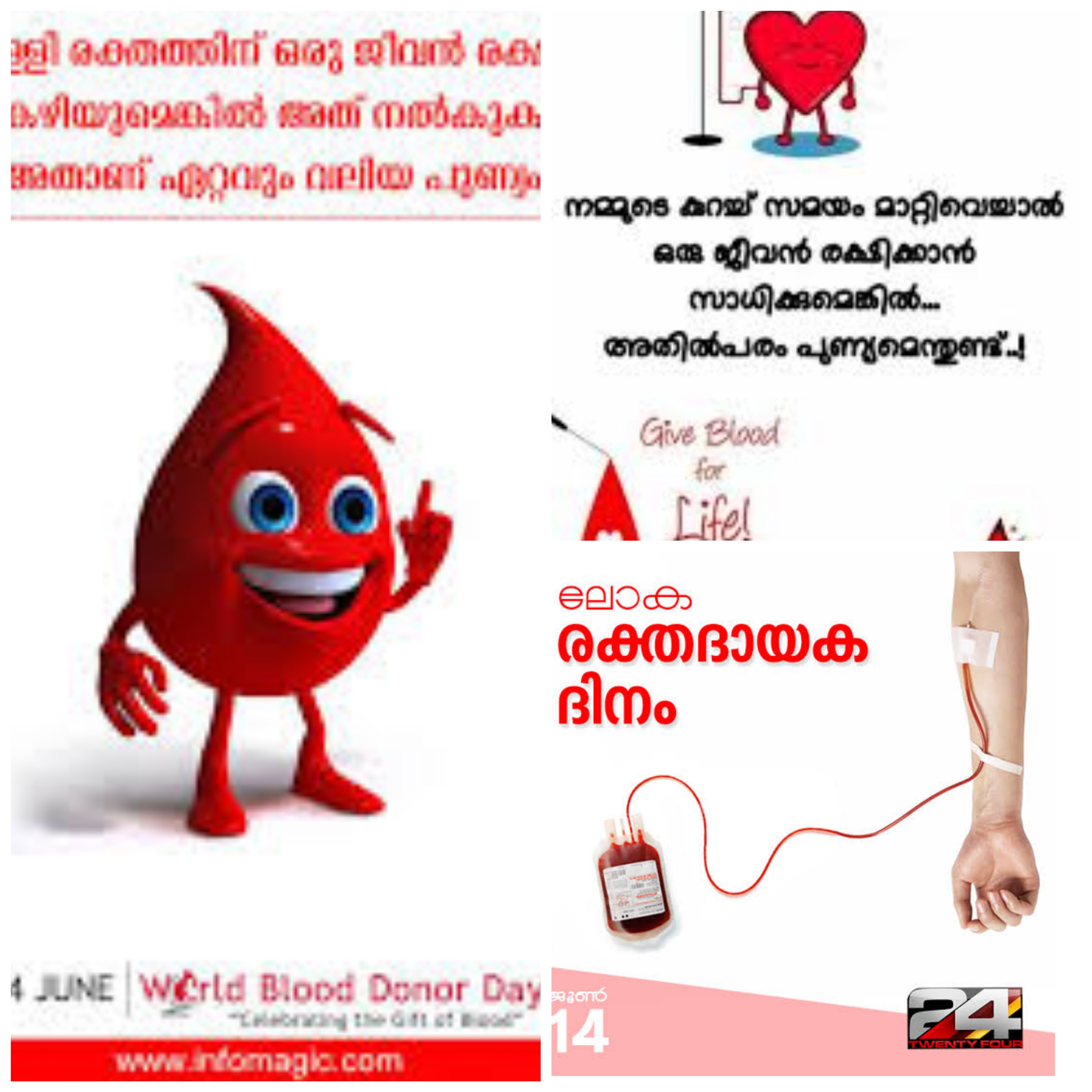 ഇന്ന് (ജൂൺ 14) ലോക രക്തദായക ദിനം. രക്തദാനം മഹാദാനം തന്നെയാണ്. രക്തദാനത്തിലൂടെ നാം രക്ഷിക്കുന്നത് വിലപ്പെട്ട മനുഷ്യ ജീവനെയാണ്. ഒരു മനുഷ്യ ജീവൻ രക്ഷിച്ചാൽ മാനവ രാശിയെ മുഴുവൻ രക്ഷിച്ചത് പോലെ എന്നാണ് വിശുദ്ധ ഖുർആൻ പ്രഖ്യാപിക്കുന്നത്. സമ്പത്ത് ദാനം ചെയ്യുന്നത് പുണ്യകരമാണെങ്കിൽ, അതിനേക്കാൾ പുണ്യകരമാണ് രക്തദാനം. മറ്റൊരാളുടെ യാതനയകറ്റുക എന്ന സൽകർമം കൂടി അതിലുണ്ട്. കുടുംബാംഗങ്ങൾക്കാണ് രക്തം ദാനം ചെയ്യുന്നതെങ്കിൽ, രണ്ടുണ്ട് ഗുണം : കുടുംബ ബന്ധം ചേർത്തതിൻ്റെയും ദാനം ചെയ്തതിൻ്റെയും പ്രതിഫലങ്ങൾ. ആരോഗ്യപരമായും ഗുണകരമാണ് രക്തദാനം. ഒഴുകുന്ന ജീവൻ എന്നാണ് രക്തത്തിന് ആരോഗ്യ വിദഗ്ധർ നൽകിയ നിർവചനം. ഒരുതുള്ളി രക്തം ഒരു പക്ഷെ ഒരു വലിയ ജീവൻ രക്ഷിക്കാം. രക്തദാനം മഹാദാനമായി മാറുന്നതും അതുകൊണ്ട് തന്നെ. രക്തഗ്രൂപ്പുകളെ തിരിച്ചറിഞ്ഞ കാൾലാന്റ് സ്റ്റെയിനർ എന്ന ശാസ്ത്രജ്ഞന്റെ ജന്മദിനമാണ് രക്തദാന ദിനമായി ലോകം ആചരിക്കുന്നത്. രക്തം ദാനം ചെയ്യുമ്പോൾ ദാതാവിന്റെ ശരീരത്തിൽ പുതിയ രക്ത കോശങ്ങൾ ഉണ്ടാവും. മാത്രമല്ല ശരീരത്തിന് കൂടുതൽ പ്രവർത്തന ക്ഷമതയും ഉന്മേഷവും നൽകും. അതുകൊണ്ട് തന്നെ രക്തദാനം ഒരു ദോഷവുമുണ്ടാക്കുന്നില്ല. രക്തദാനം ചെയ്യുന്നവരിൽ ഹൃദ്രോഗസാധ്യത കുറഞ്ഞു വരുന്നതായി കാണുന്നു. അവർക്ക് ആരോഗ്യകരമായ ജീവിതശൈലി പിന്തുടരാം. സഹജീവികളെ സഹായിക്കാനുള്ള മനസ്സ് ഉണ്ടാകുന്നു എന്നത് തന്നെ വലിയൊരു കാര്യമാണ്. രക്തദാനത്തിലൂടെ ആയുസ്സും ആരോഗ്യവും ലഭിക്കും.